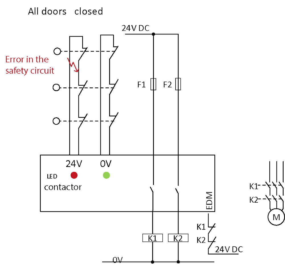 Figure 4: All doors are closed, Error in the safety circuit, 2-channel error is detected by the safety relay, Motor stopped