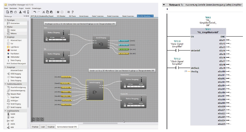 Free of charge and in an easy and effective way the Safety Simplifier provides bidirectionally all information to the higher-level standard PLC. Reprogram two of 14 inputs and/or outputs as serial outputs. Use our standard modules in the Simplifier Manager. These modules send through two outputs up to 32 pieces of information to their higher-level control unit. If these pieces of information are not sufficient, further free I/O's can be used for communication without limitation. Free of charge functional modules for Siemens and Beckhoff are available on our homepage.